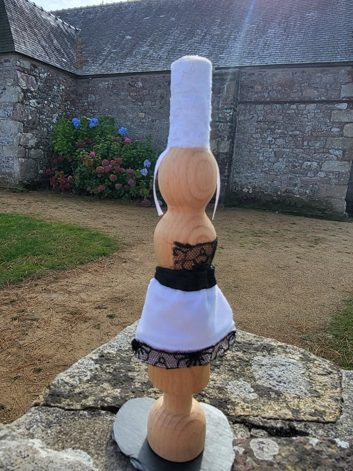 A mes débuts j’utilisais beaucoup le bois destiné à mon poêle. Aujourd’hui j’essaie de récupérer du bois de mobilier destiné à la déchetterie (pieds de table, chaises, tringles à rideau, etc …). Cette démarche de donner une seconde vie au bois est importante pour moi. Mes créations sont principalement en hêtre (échauffé parfois), en châtaignier, en chêne, en buis, en pin ou avec des fruitiers issus des jardins locaux préalablement séchés. Lorsque je souhaite donner du volume à mes personnage j’utilise des matières naturelles (noix diverses, cordage, fil de fer, etc …).