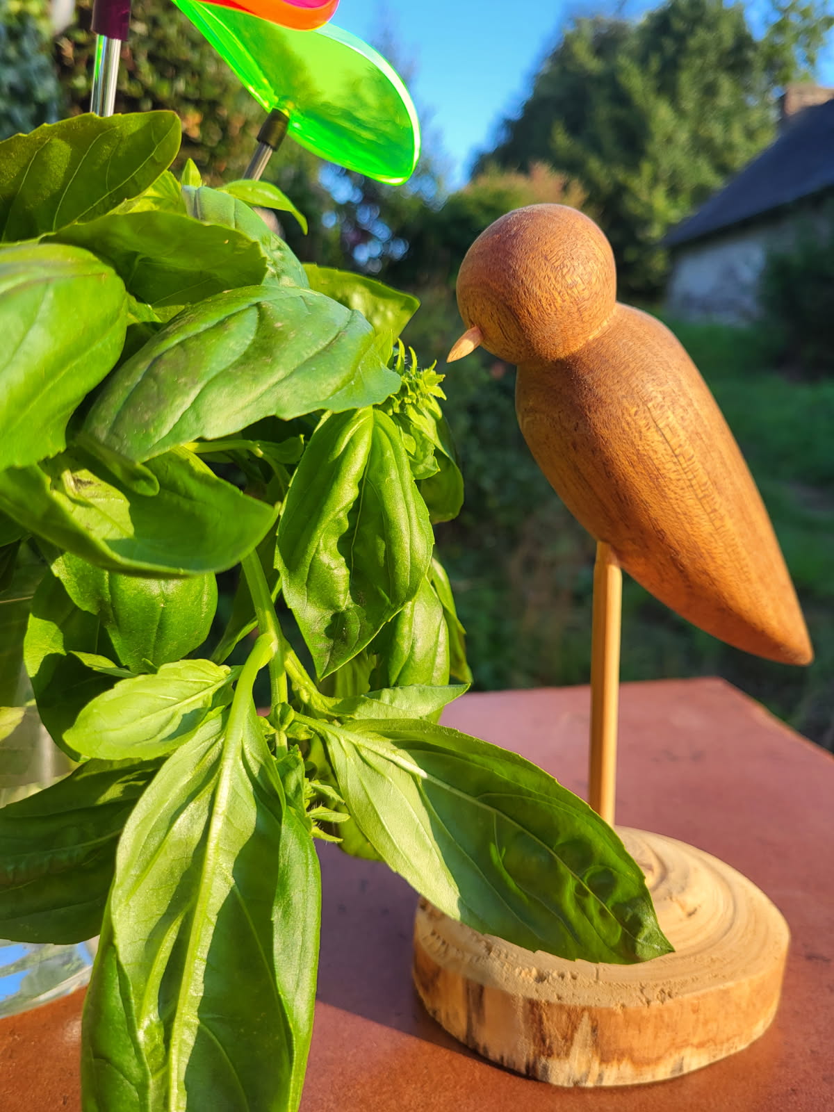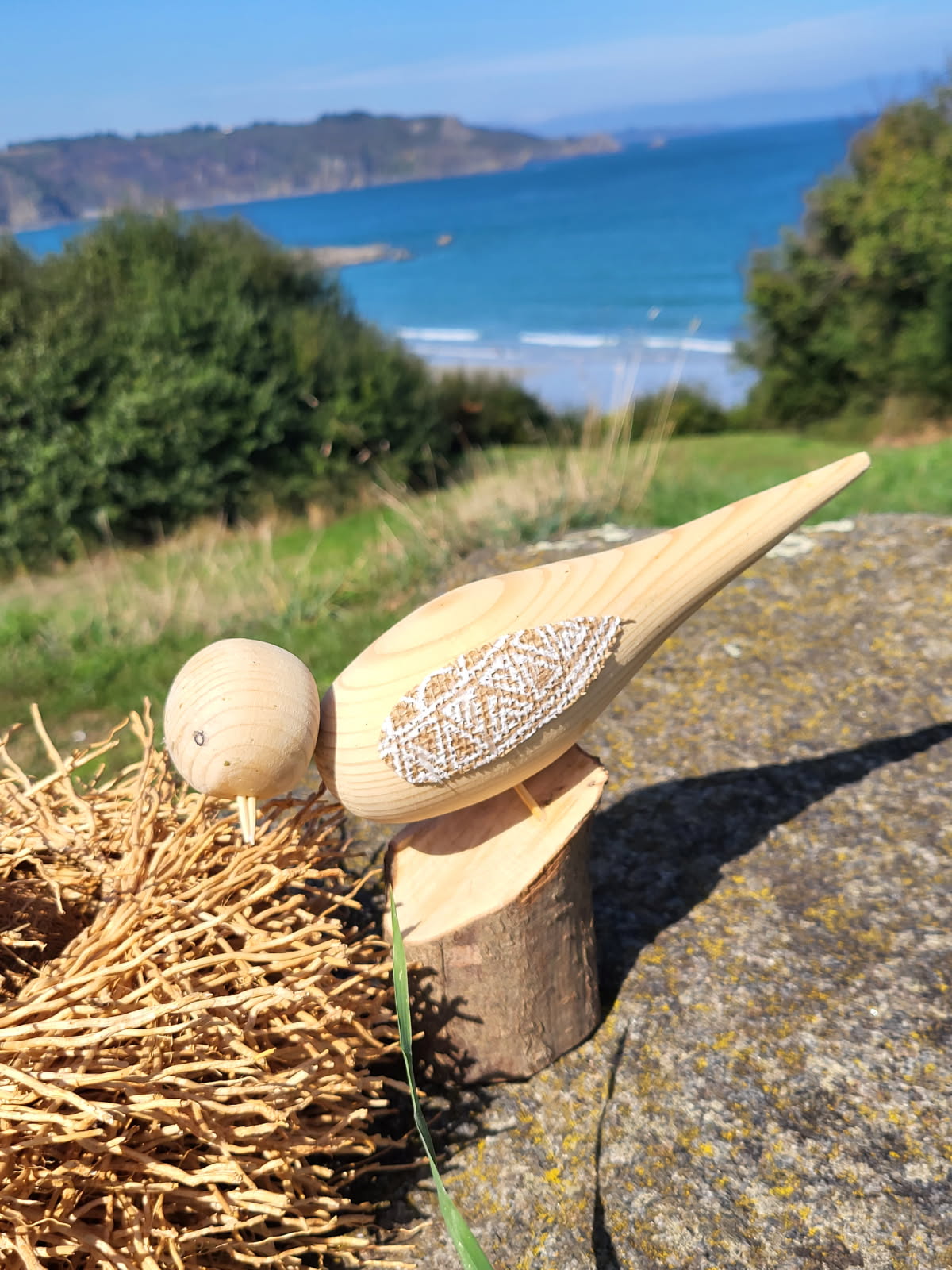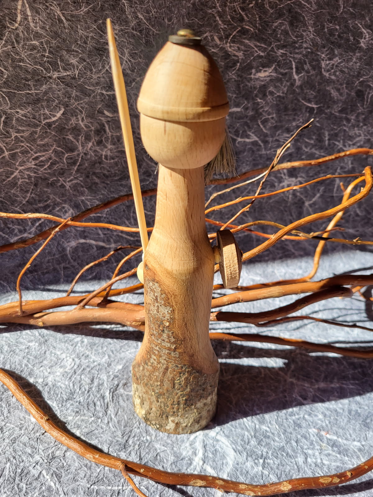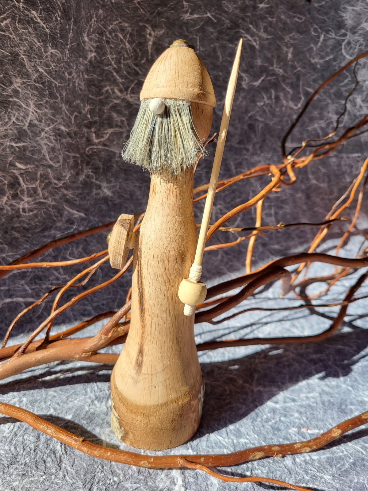 A mes débuts j’utilisais beaucoup le bois destiné à mon poêle. Aujourd’hui j’essaie de récupérer du bois de mobilier destiné à la déchetterie (pieds de table, chaises, tringles à rideau, etc …). Cette démarche de donner une seconde vie au bois est importante pour moi. Mes créations sont principalement en hêtre (échauffé parfois), en châtaignier, en chêne, en buis, en pin ou avec des fruitiers issus des jardins locaux préalablement séchés. Lorsque je souhaite donner du volume à mes personnage j’utilise des matières naturelles (noix diverses, cordage, fil de fer, etc …).